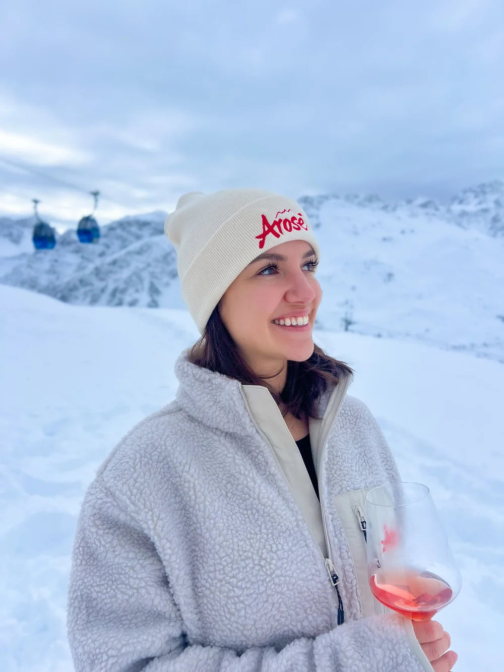 Notre bonnet tricoté Arosé tout doux te tient chaud et te donne du style en même temps. Le jeu de mots entre "Arosa" et "rosé" se porte parfaitement lors du prochain apéro.